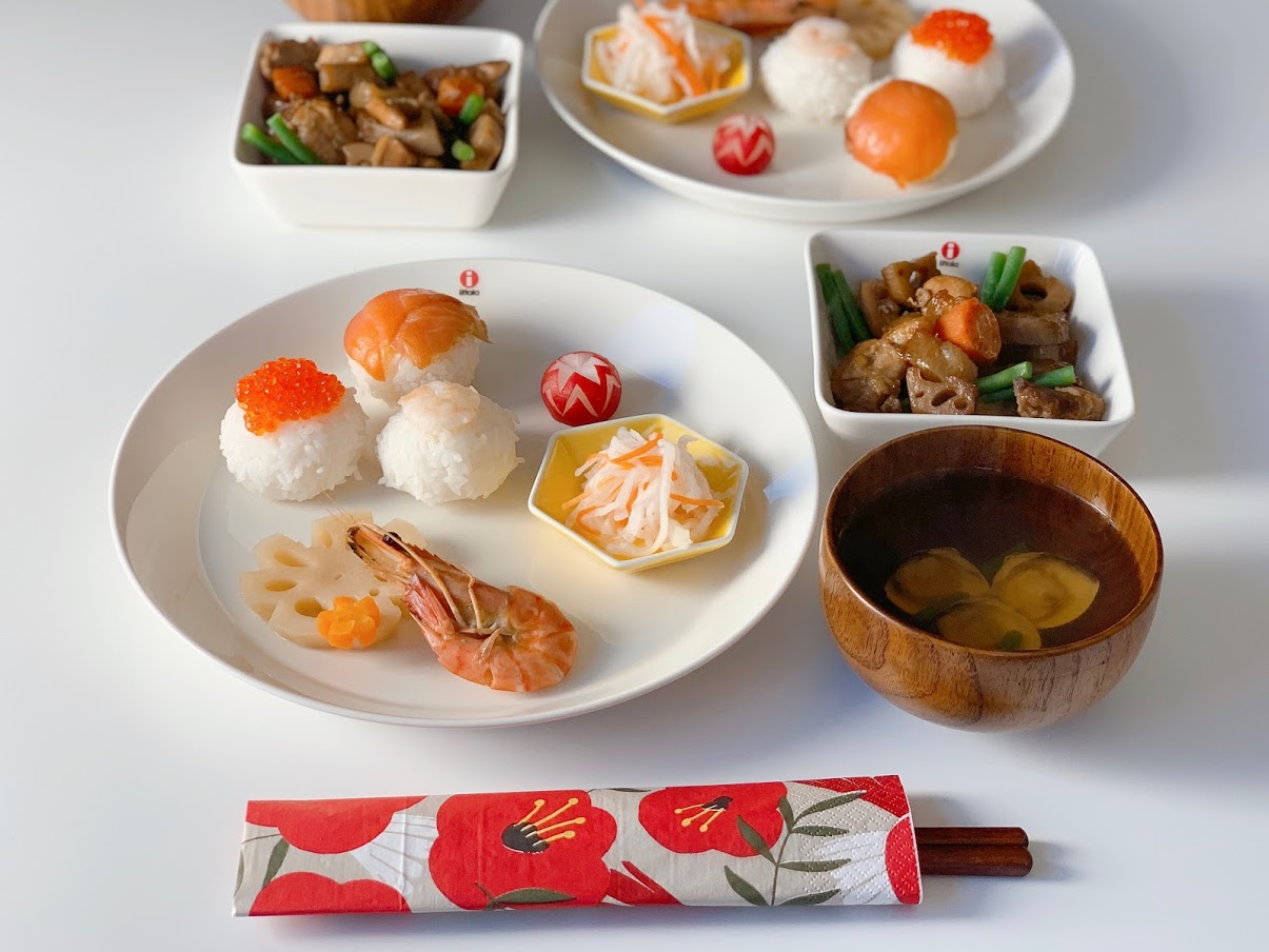 サーモン・いくら・えびの手まり寿司と、筑前煮、紅白なます、二十日大根、酢れんこん、有頭海老の煮物、そしてお吸い物。